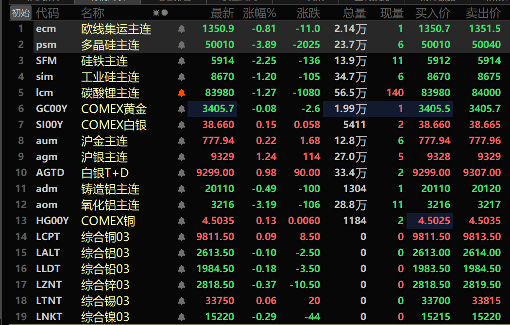 此外,铸造铝主连期货跌0.49%,氧化铝主连跌3.19%。碳酸锂主连跌1.27%,工业硅主连跌1.2%。多晶硅主连跌3.89%。