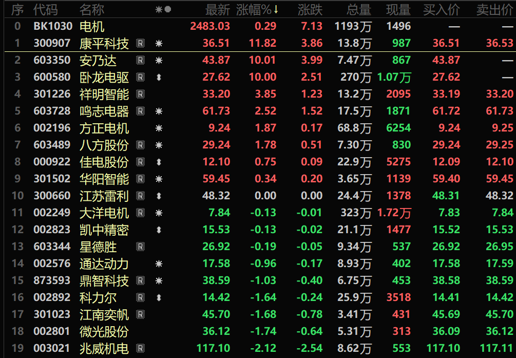 多重利好共振下,电机板块8月14日逆势走强,截至14日收盘,电机板块整体逆势上涨0.29%,其中安乃达、卧龙电驱强势涨停,康平科技、祥明智能、方正电机以及鸣志电器等多股涨幅居前。消息面上,驱动因素涵盖政策、市场与技术等多个维度:今年1880亿元超长期特别国债支持的设备更新投资补助资金已下达完毕,市场对电机制造等领域的设备更新需求预期升温;杭州就《杭州市促进具身智能机器人产业发展条例(草案)》公开征求意见,为相关电机细分赛道注入政策动能;乘联分会数据显示,8月1-10日全国乘用车新能源市场零售26.2万辆,同比、环比均增长6%,零售渗透率达57.9%,今年以来累计零售671.7万辆,同比增长28%,持续拉动驱动电机需求;此外,全球人形机器人运动会开幕叠加稀土永磁电机技术突破(6毫米超薄电机实现量产),进一步为板块行情提供了支撑。