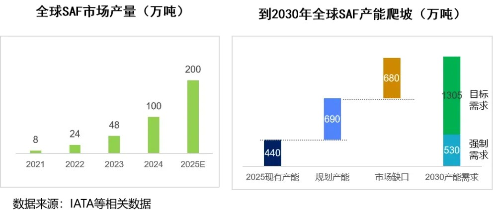 当前SAF全球供给紧缺。根据IATA数据,2025年产量预计将增长到200万吨(同比增长100%),但仅占航空燃料使用量的0.7%。截至2025年1月,SAF全球产能达到440万吨,新项目投产后将增690万吨。但按政策和航司计划,2030年需求将超1800万吨,缺口达680万吨!