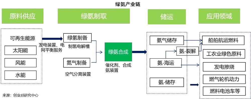 绿氨由电解水制取的绿氢与空分装置捕获的氮气经合成工艺而得。绿氨生产主要包括绿氢制备、氮气制备和合成氨三个单元。其中空气分离制备氮气和氨合成工艺技术成熟,完全可以采用现有产业技术。在绿氢制备,碱性电解槽(ALK)技术较成熟,质子交换膜(PEM)电解槽在示范应用阶段,阴离子交换膜(AEM)电解槽正在快速发展中。