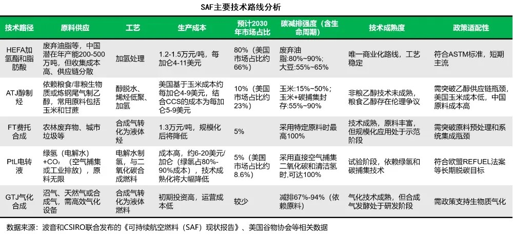 目前加氢酯和脂肪酸(HEFA)路线是商业化程度最高,约占98%产能,但原料依赖废弃食用油等有限资源,可能在2030年后引发供应缺口。生物质气化+费托合成(G+FT)、电转液(PtL)等技术路线有望在未来发挥更重要的作用。