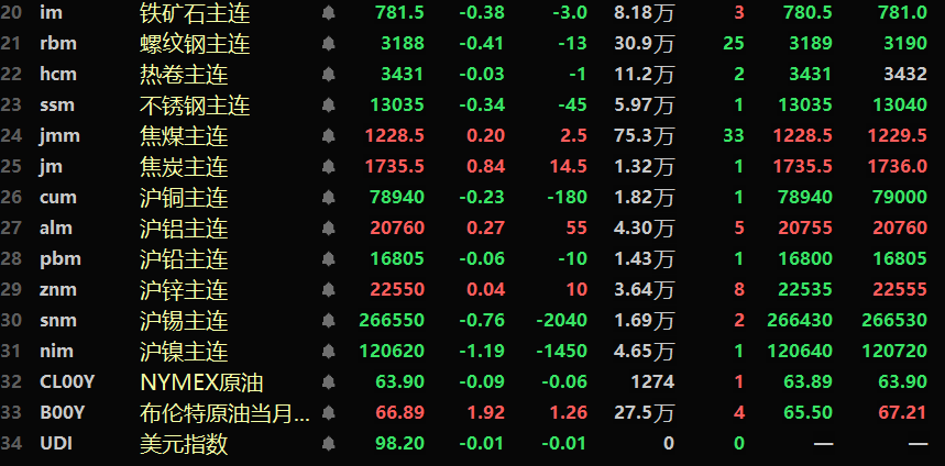 隔夜黑色系多飘绿,铁矿跌0.38%,不锈钢跌0.34%,螺纹跌0.41%,热卷微跌。双焦方面:焦煤涨0.2%,焦炭涨0.84%。