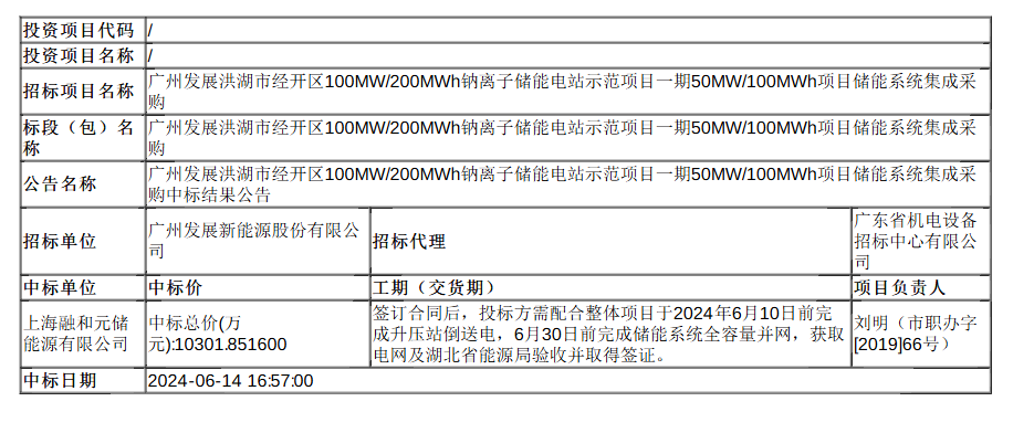 北极星储能网获悉,8月13日,广州发展洪湖市经开区100MW/200MWh钠离子储能电站示范项目一期50MW/100MWh项目储能系统集成采购发布中标结果公告,中标人为上海融和元储能源有限公司,中标价格为10301.8516万元,约合1.03元/Wh。
