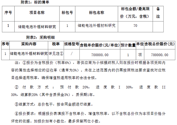 根据此前的采购信息,本项目开展新型补锂剂材料研究,包括新型补锂材料的制备开发、分解过程及机理研究,新型补锂材料的空气稳定性研究,项目资金为70万元。