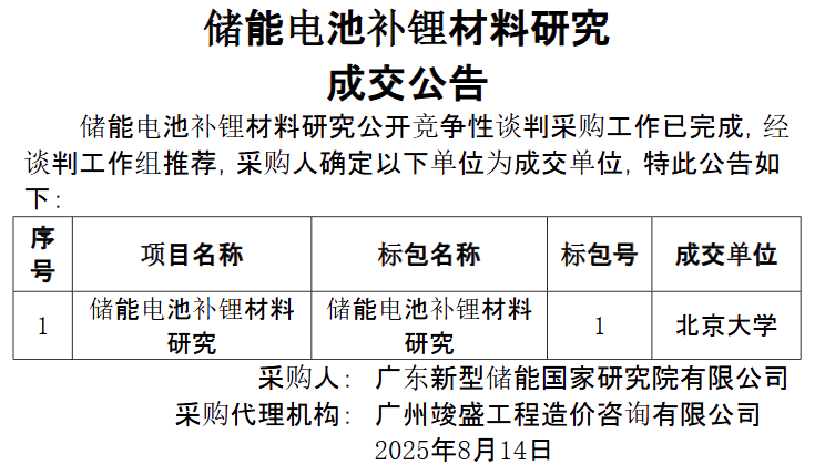 北极星储能网获悉,8月14日,北京大学成交广东新型储能国家研究院有限公司储能电池补锂材料研究项目。