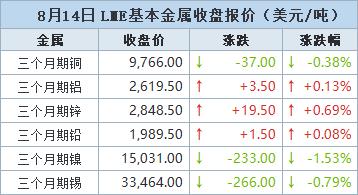 伦敦时间8月14日17:00(北京时间8月15日00:00),LME三个月期铜下跌37美元,或0.38%,收报每吨9,766.0美元。