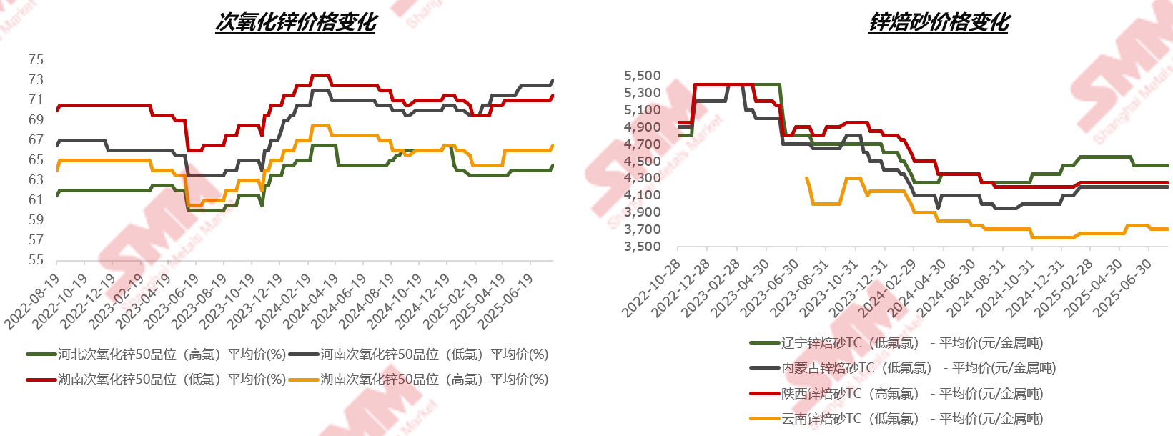 高品位低氯的次氧化锌市场接受程度更高。2025年上半年,高氯及低氯次氧化锌的价格走势出现分野。近期由于钢厂开工率下滑,高低氯含量的次氧化锌价格均有所上升。锌焙砂则由于与次氧化锌一定程度上可互相替代,需求刚性不强,价格较为平稳。