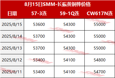 【SMM价格】2025年8月15日长振黄铜棒价格