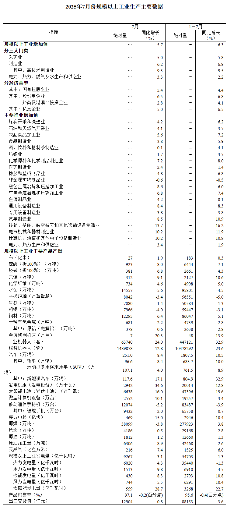 分产品看,7月份,规模以上工业623种产品中有335种产品产量同比增长。其中,钢材12295万吨,同比增长6.4%;水泥14557万吨,下降5.6%;十种有色金属681万吨,增长2.2%;乙烯312万吨,增长9.1%;汽车251.0万辆,增长8.4%,其中新能源汽车117.6万辆,增长17.1%;发电量9267亿千瓦时,增长3.1%;原油加工量6306万吨,增长8.9%。