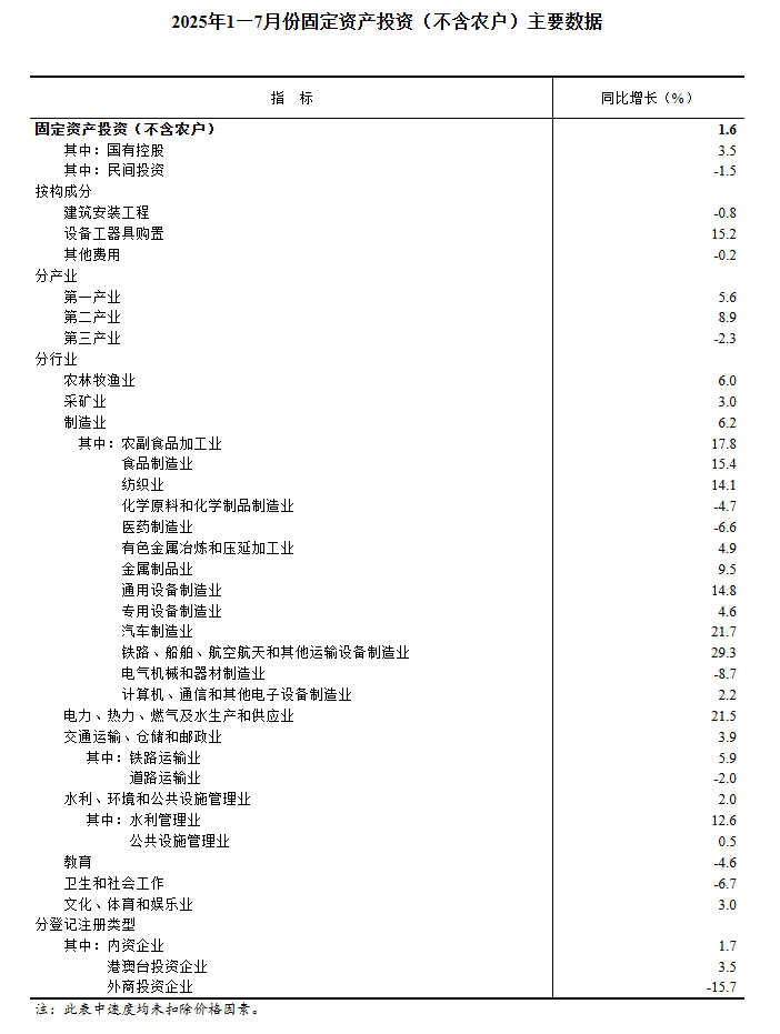 2025年1—7月份,全国固定资产投资(不含农户)288229亿元,同比增长1.6%(按可比口径计算)。其中,民间固定资产投资同比下降1.5%。从环比看,7月份固定资产投资(不含农户)下降0.63%。
