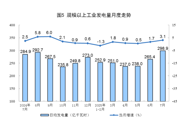 规上工业电力生产增长加快。7月份,规上工业发电量9267亿千瓦时,同比增长3.1%,增速比6月份加快1.4个百分点;日均发电298.9亿千瓦时。1—7月份,规上工业发电量54703亿千瓦时,同比增长1.3%,扣除天数原因,日均发电量同比增长1.8%。