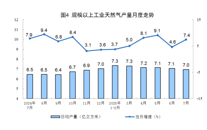 天然气生产增速加快。7月份,规上工业天然气产量216亿立方米,同比增长7.4%,增速比6月份加快2.8个百分点;日均产量7.0亿立方米。