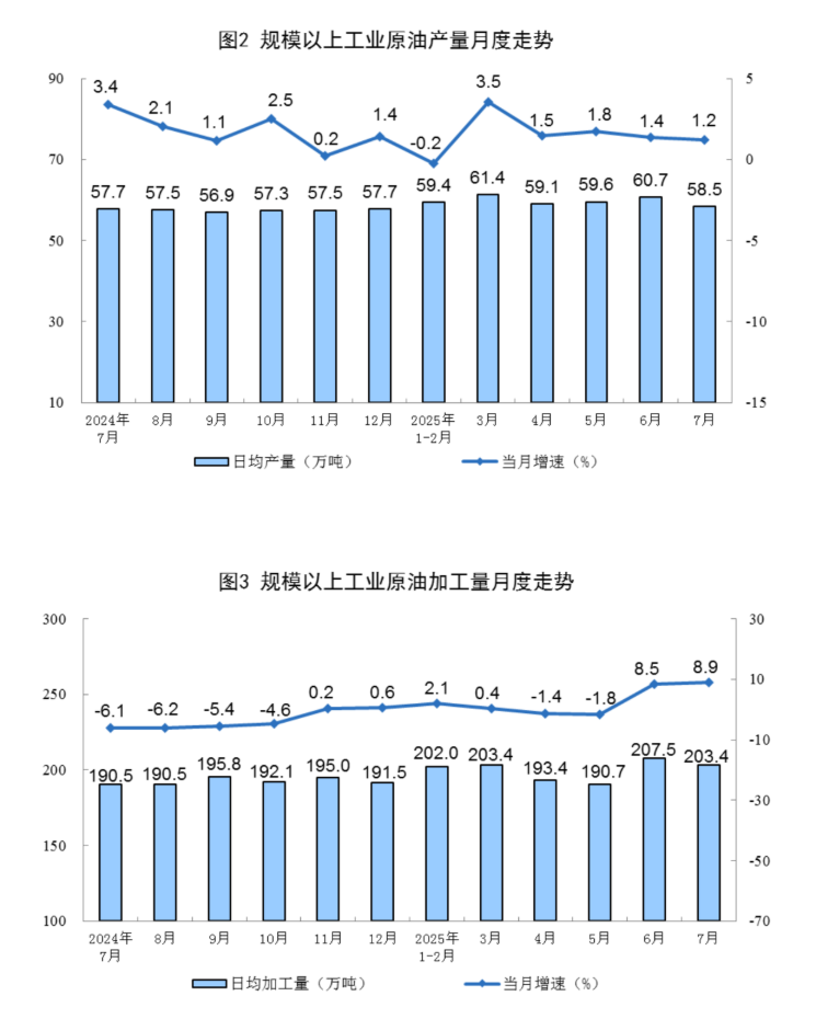 原油生产稳定增长。7月份,规上工业原油产量1812万吨,同比增长1.2%,增速比6月份放缓0.2个百分点;日均产量58.5万吨。