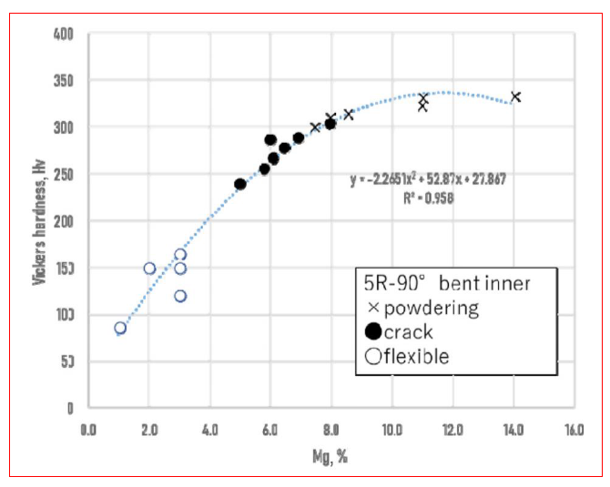如图所示:展示了镁浓度与维氏硬度之间的关系。经证实,随着镀层中镁浓度的增加,维氏硬度也随之提升,且镁含量百分比与维氏硬度的关系可通过二次函数近似拟合。当镁浓度低于4%时,在5R-90°弯曲试验中未观察到镀层内表面出现裂纹或剥落现象。镁浓度达到7.5%前,镀层内表面仅出现裂纹但未发生剥落。然而当镁浓度达到或超过7.5%时,镀层开始出现剥落,且维氏硬度达到300Hv时剥落现象开始显现。基于上述结果,可以推断在7%至7.5%的组分区间存在一个镀层开始发生剥落的临界点。