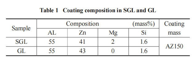 55%铝锌-1.6%硅合金热浸镀钢板(以下简称GL)具有优异的耐腐蚀性能,作为镀层钢板广泛应用于建材领域,并作为预涂钢板基材使用。与此同时,在屋顶、墙面等建材应用领域,存在延长建筑物使用寿命或在沿海地区等严苛腐蚀环境下使用的需求,因此对进一步提升耐腐蚀性能的要求日益增长。以锌-11%铝-3%镁-0.2%硅合金热浸镀钢板(SuperDyma™)和锌-6%铝-3%镁合金热浸镀钢板(ZAM™)为代表,日本钢铁公司通过开发锌-铝-镁三元共晶相位的镀层技术(即在镀层成分中添加镁元素),建立了提升耐腐蚀性能的工艺体系。为改善GL产品的耐腐蚀性,该公司进而研究了在GL成分中添加镁元素的效果。研究结果表明,在GL基础成分中添加约2%的镁可最大程度提升耐腐蚀性能3),由此成功开发出55%铝锌-2%镁-1.6%硅合金热浸镀钢板SGL™(以下简称SGL)。表1展示了SGL与GL镀层的成分对比。重点介绍SGL镀层钢板的特性与耐腐蚀性能,以及采用SGL作为基材的预涂钢板产品的耐腐蚀表现。