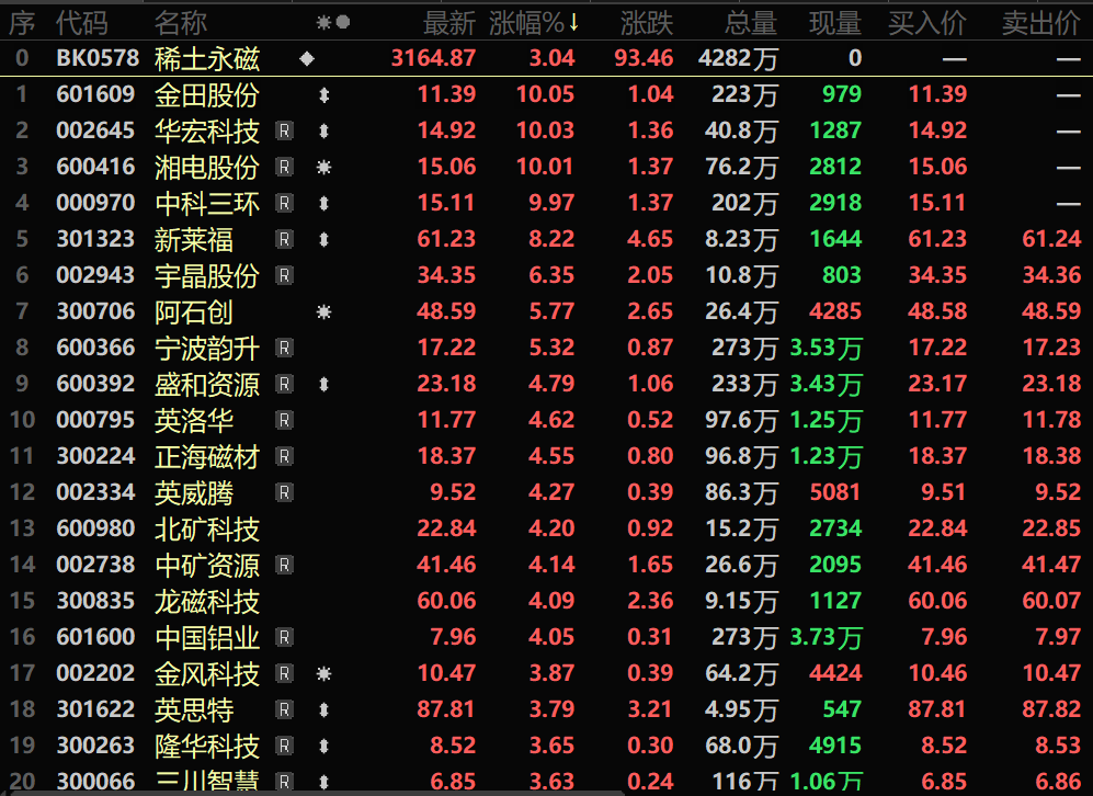 稀土永磁概念大涨金田股份、中科三环、华宏科技等涨停