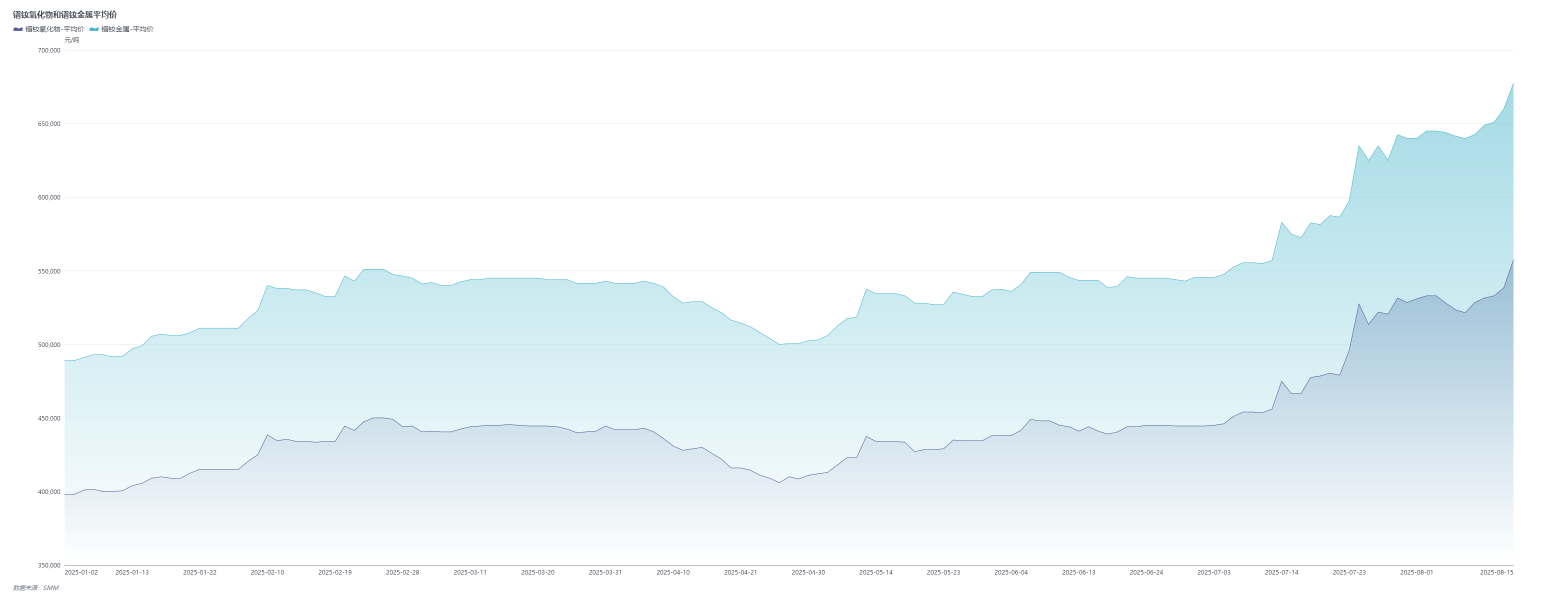 受多家大厂密集招标的提振,叠加部分磁材企业排产已延至十月中旬,需求端的积极信号持续释放,直接带动镨钕价格迎来五连涨。具体来看,截至8月15日,氧化镨钕今年以来上涨了40.08%,镨钕金属今年亦录得了38.55%的涨幅。值得关注的是,在连番上涨的行情下,市场成交热度并未减弱,反而保持比较旺盛的态势——而据SMM了解,8月15日镨钕金属的市场成交价已攀升至69万元/吨。这一系列表现清晰表明,终端需求的持续释放正为稀土产业链价格提供强劲支撑。