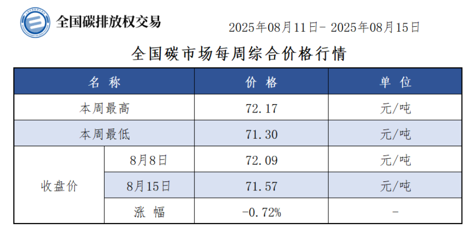 本周全国碳市场综合价格行情为:最高价72.17元/吨,最低价71.30元/吨,收盘价较上周五下跌0.72%。