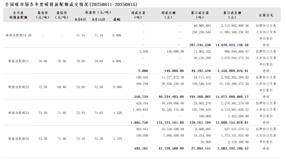 2025年1月1日至8月15日,全国碳市场碳排放配额成交量57,086,231吨,成交额4,223,021,554.63元。