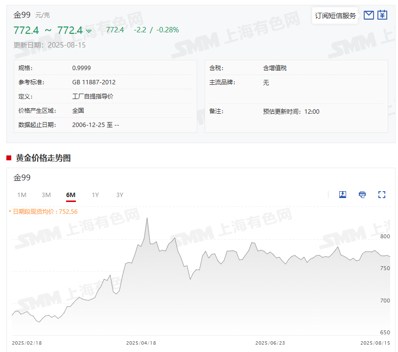 金99现货6月30日的均价为761元/克,与2024年12月31日的均价614.4元/克相比,涨幅为23.86%。而其8月15日的均价为772.4元/克,与前一交易日相比下降了0.28%。