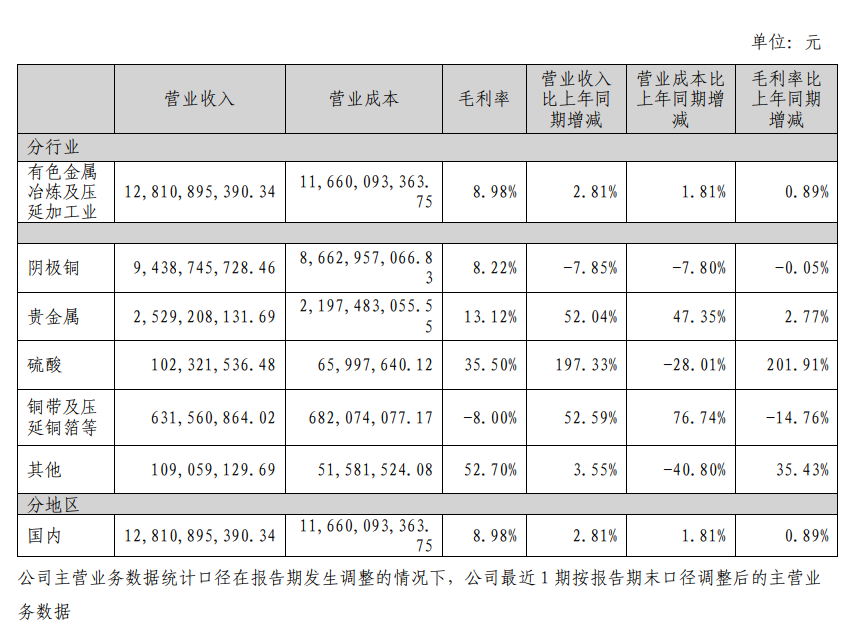 从分行业的毛利率比上年同期增减情况来看,贵金属和硫酸的毛利率比上年同期出现了增加,尤其是硫酸的毛利率同比增长了201.91%。