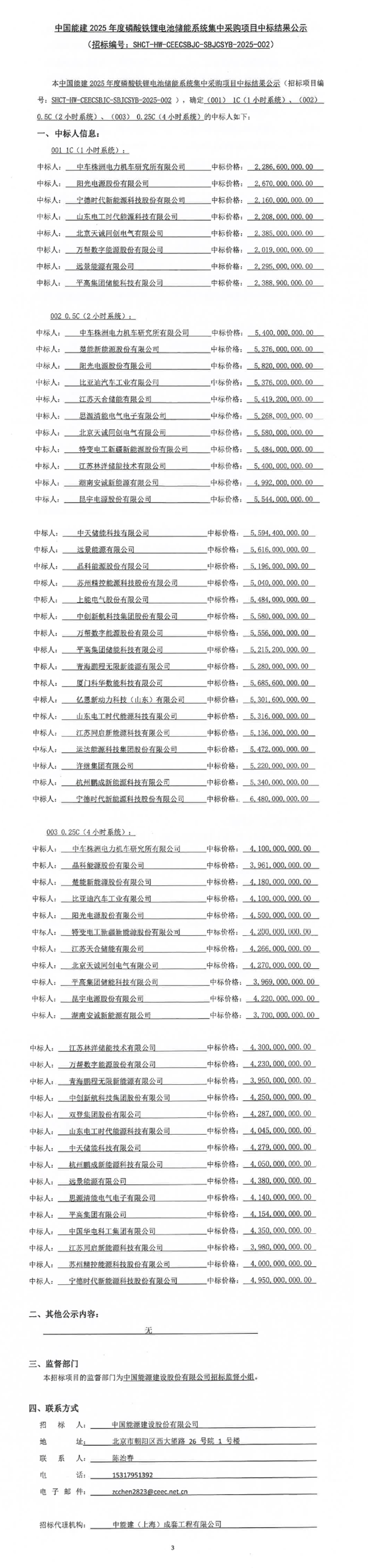 北极星储能网获悉,8月14日,中国能建2025年度磷酸铁锂电池储能系统集中采购项目中标结果公示。三个标段去重后共有31家储能企业中标,其中1C中标价格范围为0.673-0.89元/Wh,0.5C中标价格范围为0.416-0.54元/Wh,0.25C中标价格范围0.37-0.495元/Wh。