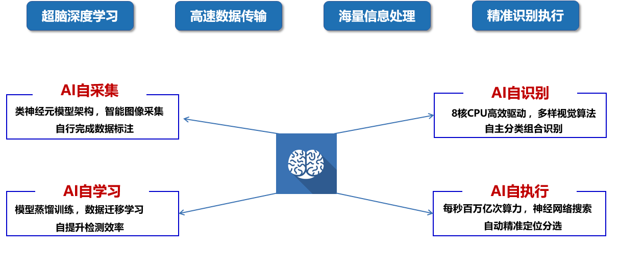 深度学习技术:采集大量物料样本 ,基于人工智能深度学习算法预训练;算法模型 ,实现待检物料的在线检测、分割、分类。