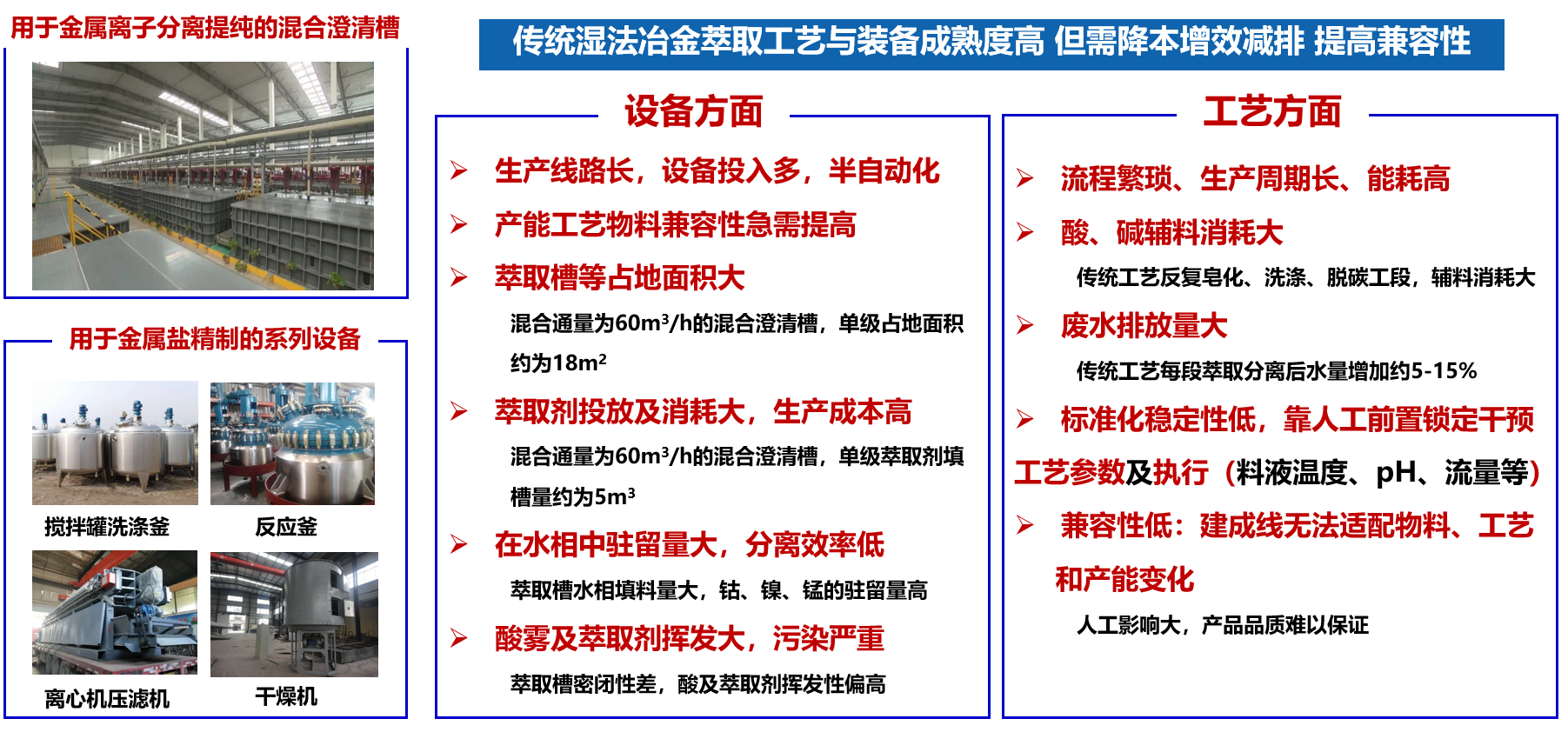 1.连续运行、处理量大、效率高、成本低、萃取剂循环使用、固废极少。