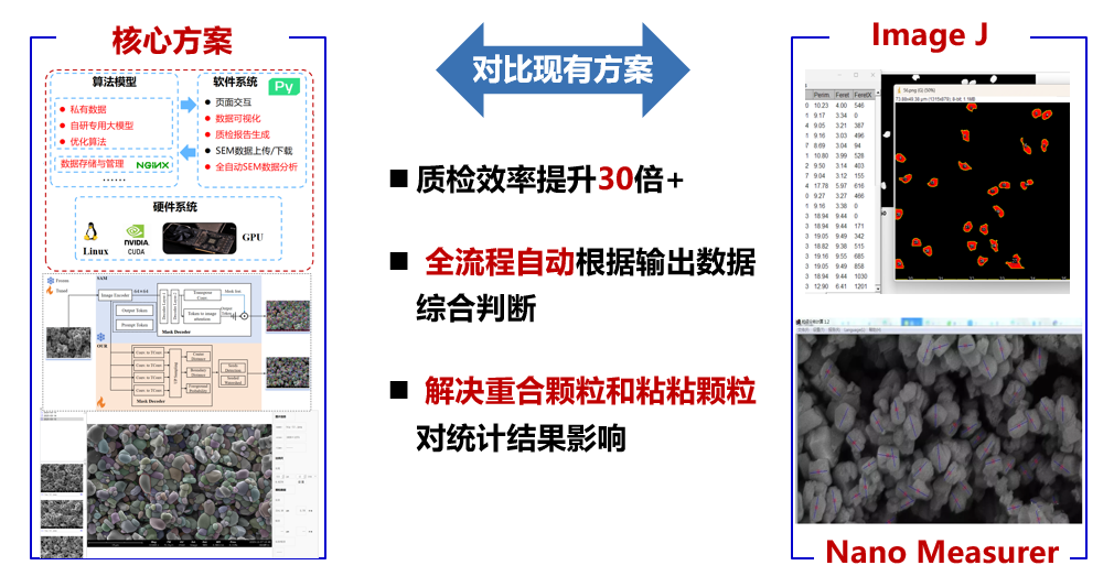 对SEM图像中颗粒检测识别,计算相关数据,实现锂电池材料质量评估,实现全自动智能化质检。