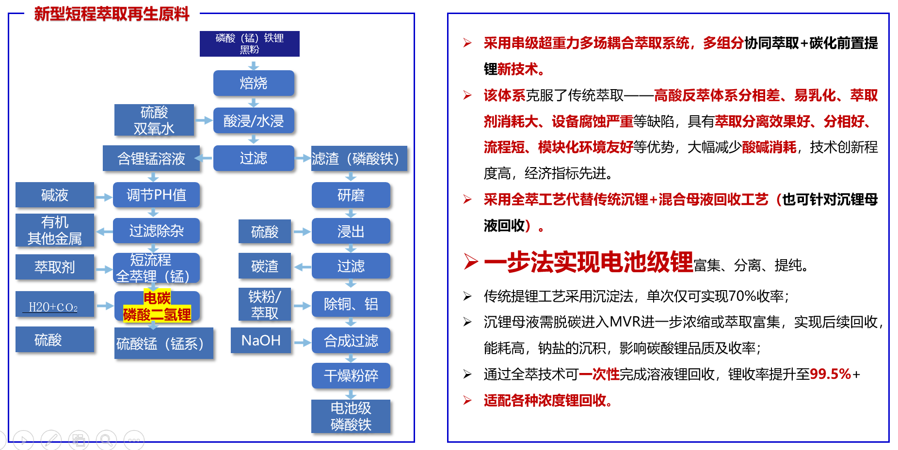 此外,他还介绍了三元正极回收-超重力单萃镍钴锰 前提锂全萃+碳化前置的相关情况。