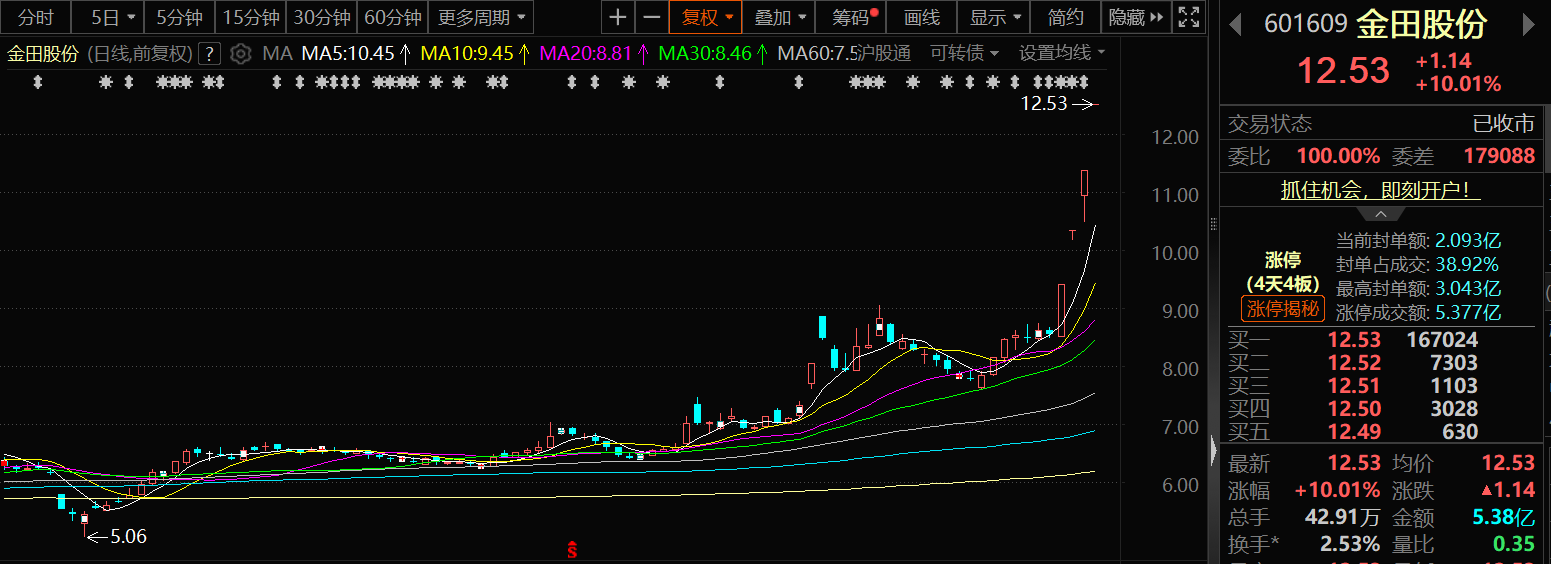 8月18日,金田股份开盘继续涨停,并维持涨停至18日收盘,至此金田股份已经收获了4个涨停板,而其股价也涨至12.53元/股。