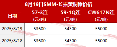 【SMM价格】2025年8月19日长振黄铜棒价格