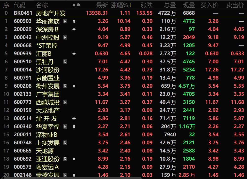 这一系列利好政策带动房地产服务和开发板块均出现上涨,截至8月19日收盘,房地产服务涨1.9%,房地产开发涨1.11%,个股方面:华丽家族、电子城涨停,深深房B、南都物业、沙河股份、汇丽B、京能置业、西藏城投、衢州发展以及中洲控股等涨幅居前。
