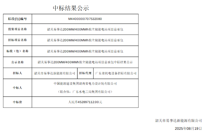 北极星储能网获悉,8月19日,广东韶关易事达200MW/400MWh独立储能电站项目总承包发布中标公告,中标人为中国能源建设集团湖南省电力设计院有限公司(联合体:广东水电二局集团有限公司),中标价为人民币452897112.00元,约合1.132元/Wh。