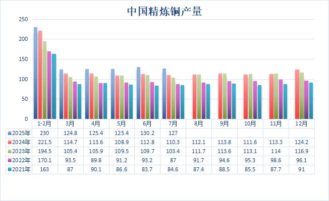 国家统计局发布报告显示,中国2025年7月精炼铜(电解铜)产量为127万吨,同比增加14%。新投产的冶炼厂的产能利用率在快速上升,前期产量下降的冶炼厂恢复生产,但受冷料供应愈发紧张影响,部分冶炼厂开始出现小幅减产,7月铜产量小幅下滑。进入8月,SMM统计,仅有1家冶炼厂有检修计划,因检修导致产量下降的量并不大;但因受铜精矿和冷料供应紧张影响,8月因此而减产的冶炼厂较7月增加。不过,受检修结束影响和华东新投产的冶炼厂仍在持续爬产刺激。