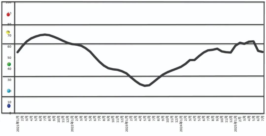 7月份,中国铝冶炼产业景气指数为55.1,较6月份下降1个点,处于“正常”区间上部。行业仍然保持一定景气度,市场供需格局基本稳定,但地缘政治和关税贸易摩擦对部分指标造成负面影响,需引起关注。中国铝冶炼产业月度景气指数走势见图 1。
