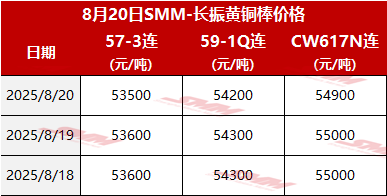 【SMM价格】2025年8月20日长振黄铜棒价格