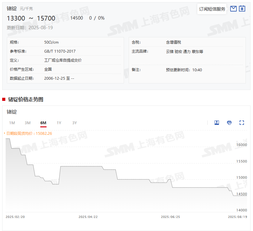 8月20日,锗锭均价为14500元/千克,这一均价与8月11日的均价持平;二氧化锗均价为10100元/千克,这一均价与6月24日持平。