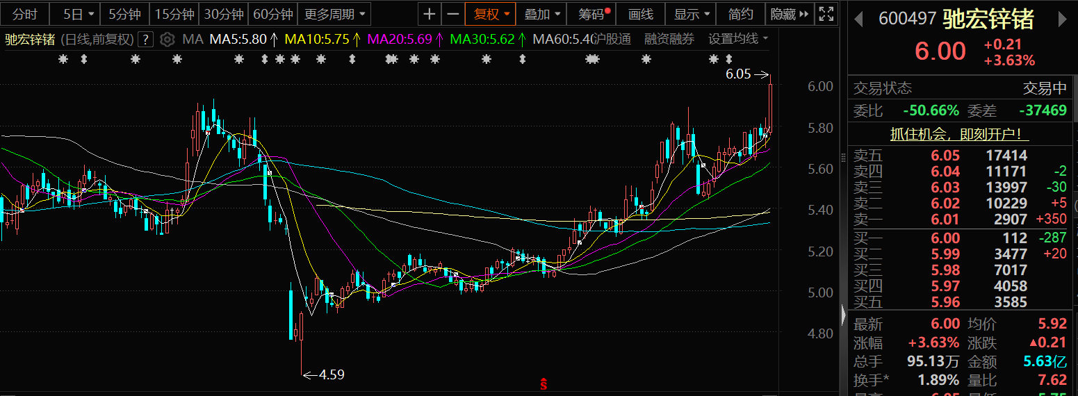 8月20日,驰宏锌锗股价出现上涨,截至20日10:00,驰宏锌锗涨3.63%,报6元/股。