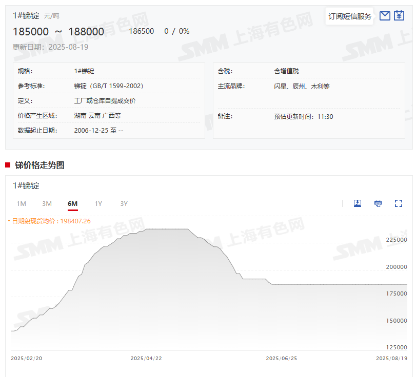 8月20日,SMM1#锑锭的均价为186500元/吨。时值夏季淡季,目前锑市场价格整体平稳。目前终端需求不佳依旧是市场信心不足的主要原因。供应端目前并没有太多的变化,目前锑矿依旧偏紧,导致锑锭偏紧,原料及锑锭价格筑底转强趋势明显。不少市场人士认为,目前决定市场走势最重要的两个因素一个是出口政策的变化导致的锑产品出口量的变化,特别是近期市场传闻锑加工品的出口申请顺畅,这也一定程度上增加了市场信心。不过另一方面,目前下游由于淡季影响,备货准备也迟迟没有到来。后市关注备货需求何时增加。