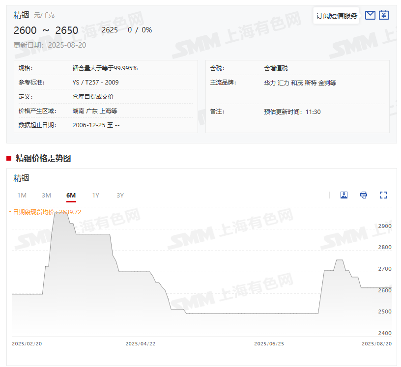 8月20日,SMM精铟现货的报价为2600一2650元/千克,其均价为2625元/千克,自8月6日,精铟均价跌至2625元/千克之后,便一直持稳于此。