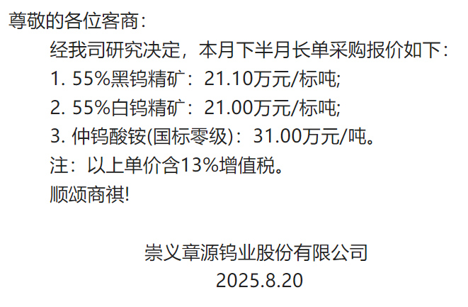 据崇义章源钨业8月20日消息:崇义章源钨业股份有限公司8月下半月长单采购报价如下:1. 55%黑钨精矿:21.1万元/标吨,较上轮报价上调1.85万元/标吨;2. 55%白钨精矿:21万元/标吨,较上轮报价上调1.85万元/标吨;3. 仲钨酸铵(国标零级):31万元/吨,较上轮报价上调2.7万元/吨。