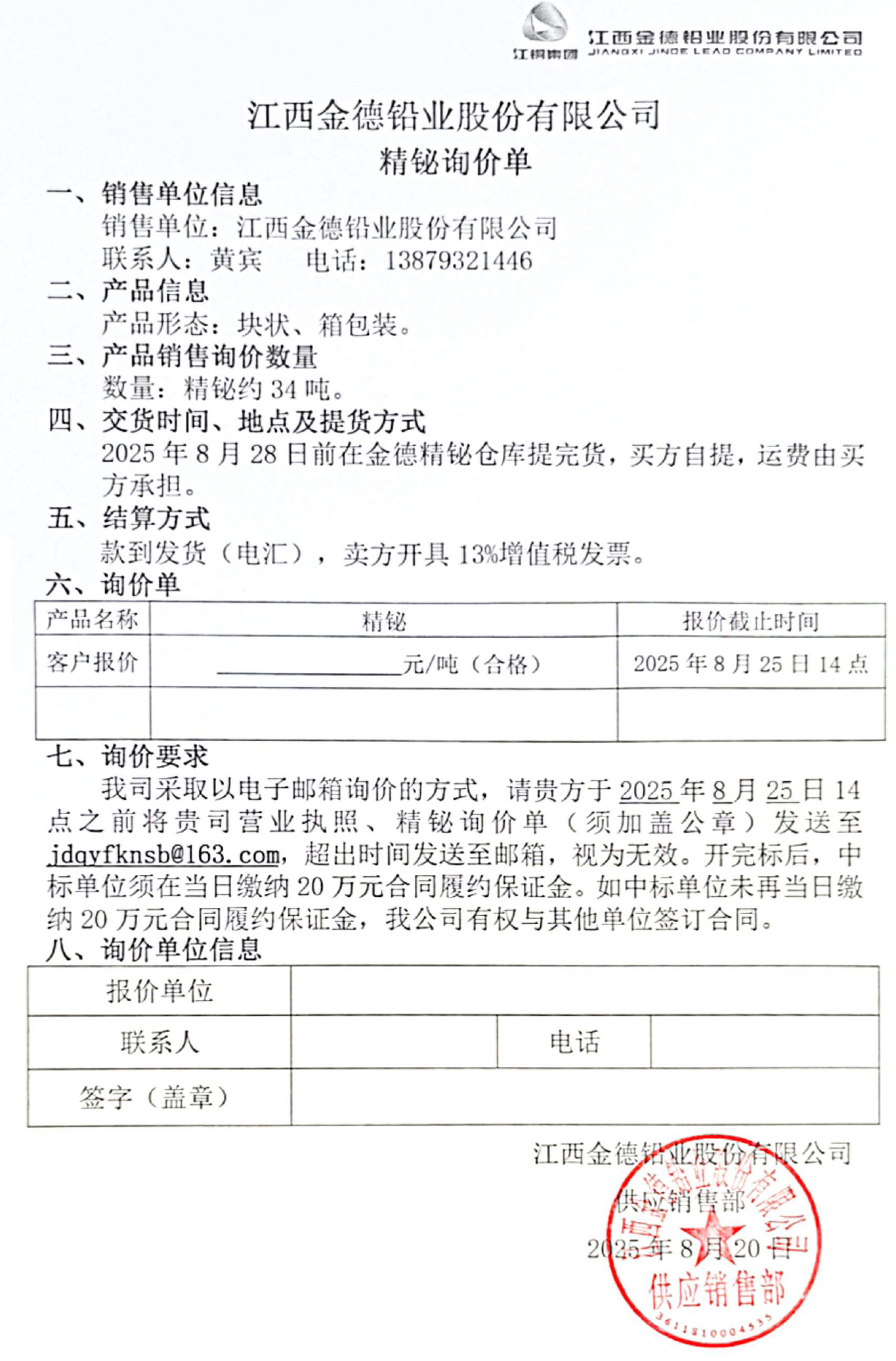 近期,江西金德铅业股份有限公司发布精铋询价单,公告显示,公司销售询价的精铋数量约34吨,2025你那8月28日前在金德精铋仓库提完货,买方自提,运费由买方承担。
