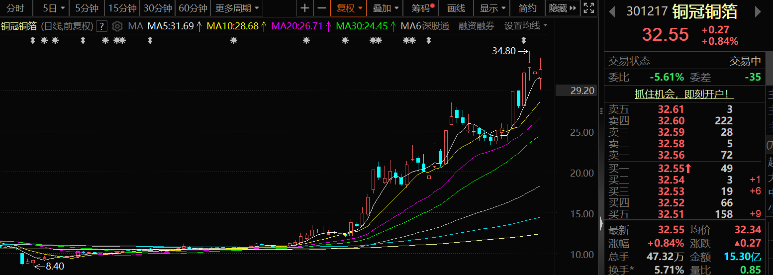 8月20日,铜冠铜箔股价出现上涨,截至20日13:43分,铜冠铜箔涨0.84%,报32.55元/股。