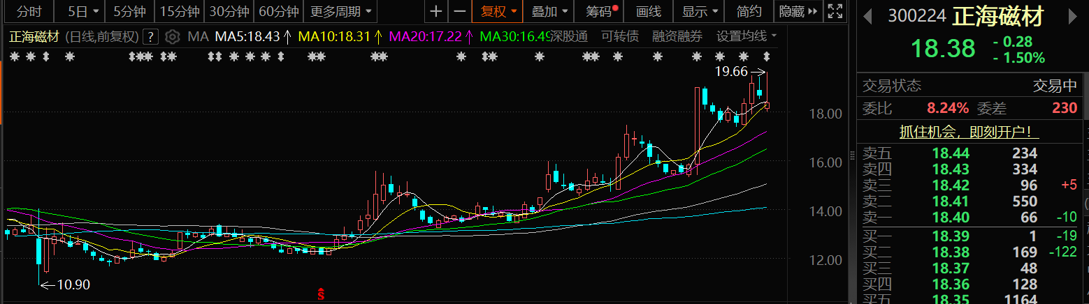 8月20日,正海磁材股价出现下跌,截至8月20日14:19分,正海磁材跌1.5%,报18.38元/股。