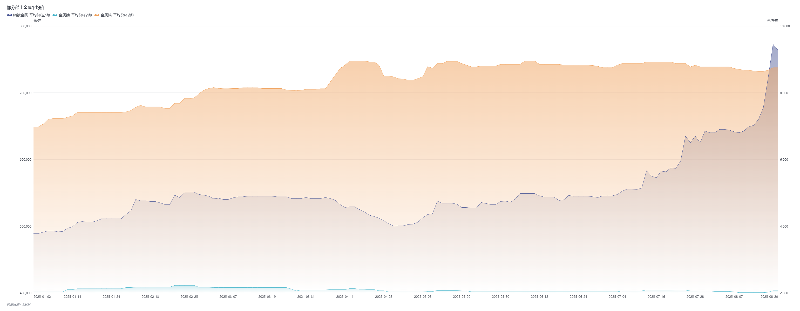 据SMM报价显示:8月20日,SMM镨钕金属价格下调至76-76.8万元/吨,镝铁合金价格稳定在160-163万元/吨,金属铽报价稳定在870-880万元/吨,钆铁合金价格上调至17.2-17.5万元/吨,钬铁市场价格稳定在52-52.5万元/吨,镧铈金属价格则继续稳定在1.7-1.9万元/吨之间。