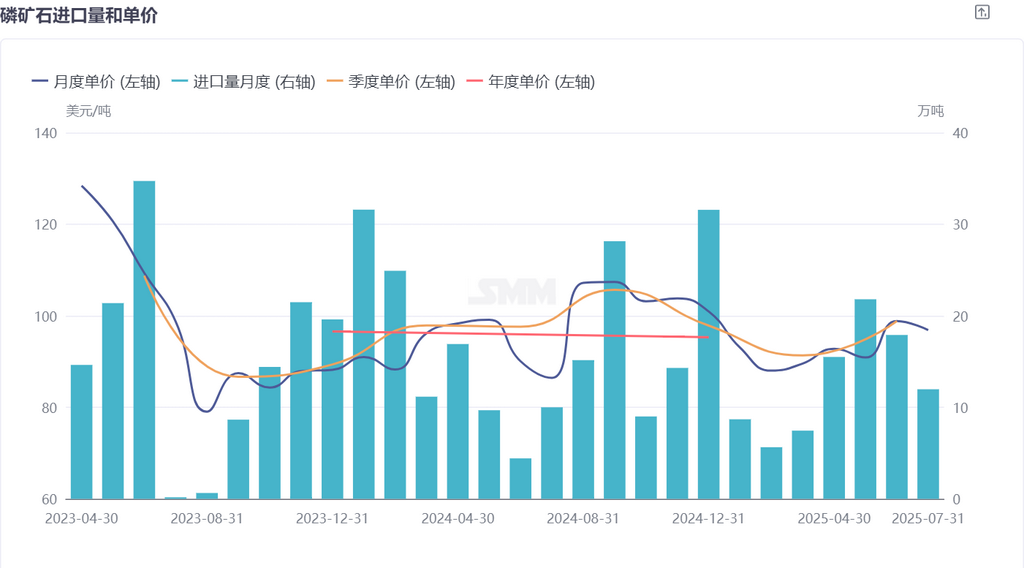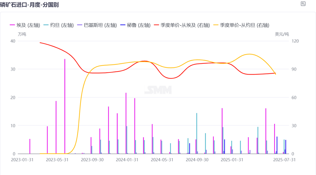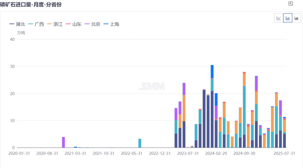 2025年7月,中国磷矿石进口量从6月的17.9万吨降至12.0万吨,环比下降33.1%;进口金额从1768.6万美元降至1160.0万美元,环比下降34.4%。约旦取代埃及成为最大进口国。出口量从0.5万吨增至1.1万吨,环比增长118.7%,福建成为唯一出口省份。