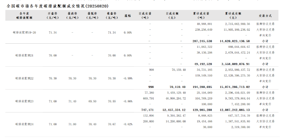 截至2025年8月20日,全国碳市场碳排放配额累计成交量689,077,332吨,累计成交额47,377,619,861.83元。