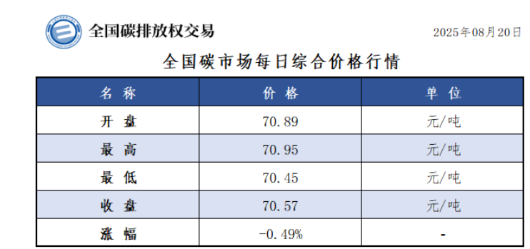 今日全国碳市场综合价格行情为: 开盘价70.89元/吨,最高价70.95元/吨,最低价70.45元/吨,收盘价70.57元/吨,收盘价较前一日下跌0.49%。