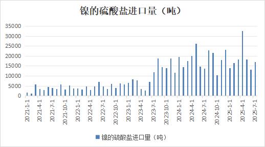 据中国海关数据统计,2025年7月中国镍的硫酸盐进口量16935.261吨,环比增加3665.996吨,上升27.63%;同比增加3313.43吨,上升24.32%。2025年1-7月中国镍的硫酸盐进口总量129896.77吨,同比增加2.69%。7月进口硫酸镍小幅增长,处于近两年均值水平。